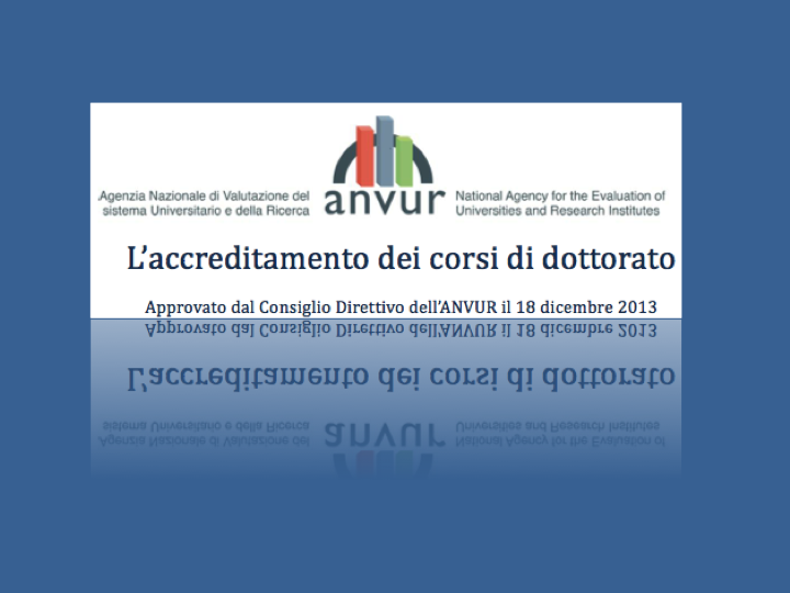 Pubblichiamo sul sito la versione preliminare del documento, approvato dal Consiglio Direttivo dell’ANVUR il 18 dicembre 2013, che descrive i criteri e gli indicatori per l’accreditamento dei corsi di dottorato.