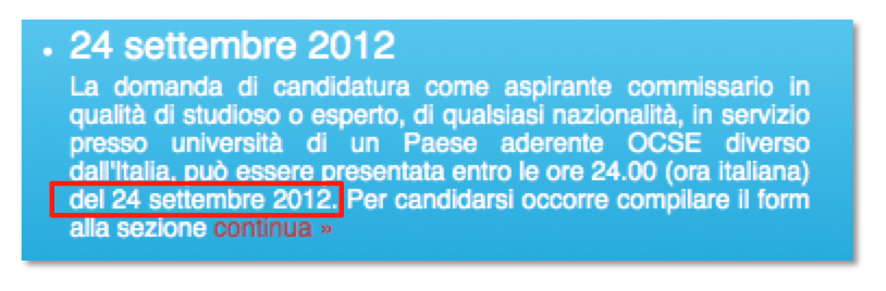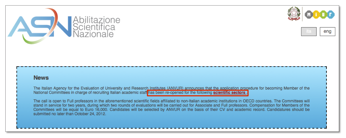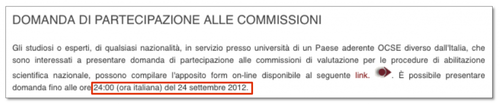 Nel riquadro NEWS E SCADENZE del sito dell’Abilitazione Scientifica Nazionale appare in evidenza che il 24 settembre era l’ultimo giorno entro il quale potevano presentare domanda gli aspiranti commissari in servizio presso università di un Paese aderente OCSE diverso dall’Italia: