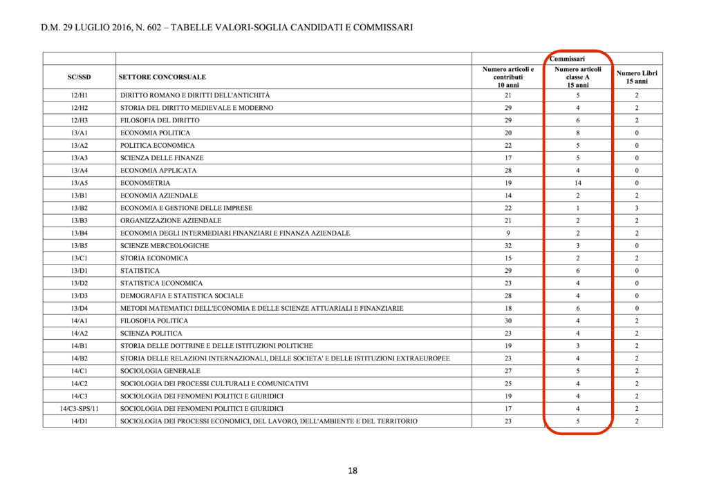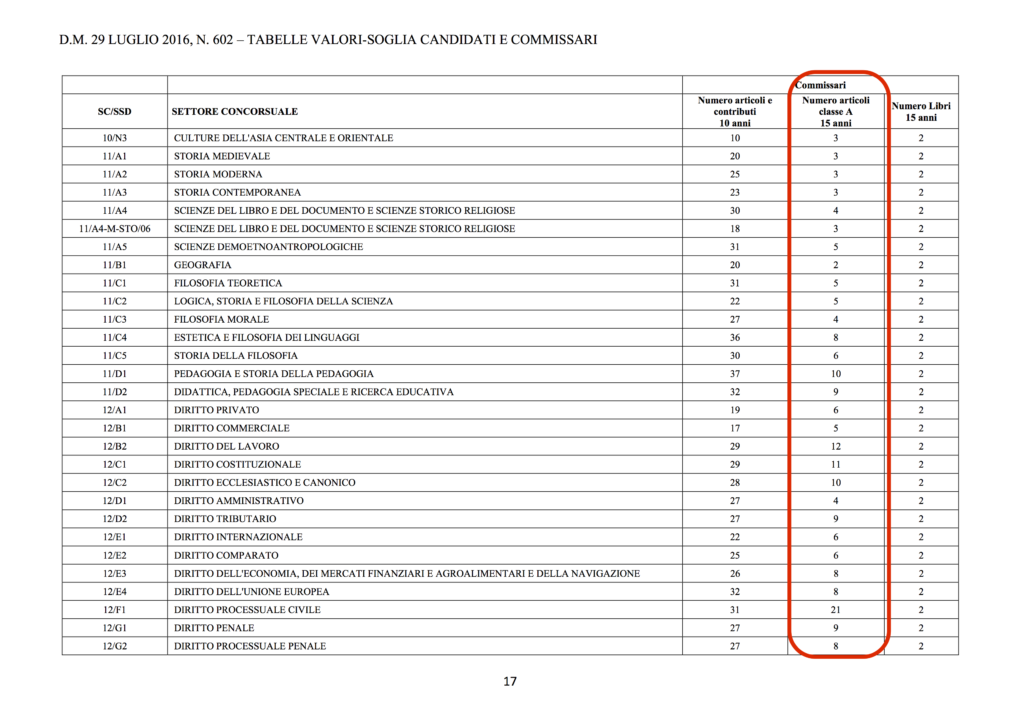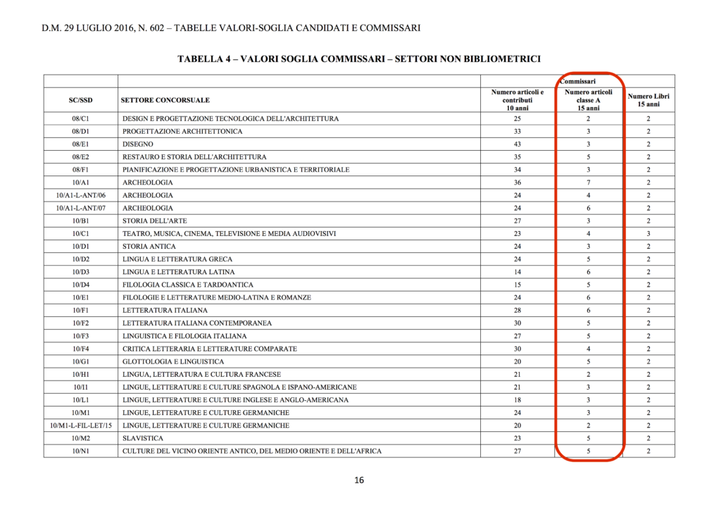 Come si vede dalle tabelle ministeriali che riproduciamo integralmente in fondo al post, non esiste nessun settore concorsuale in cui la soglia delle pubblicazioni in fascia A sia nulla. Naturalmente, secondo le regole dell’ASN, un commissario potrebbe non aver pubblicato nulla in fascia A, ma in tal caso deve superare le altre due soglie (anch’esse sempre diverse da zero) relative ad articoli & contributi e alle monografie.