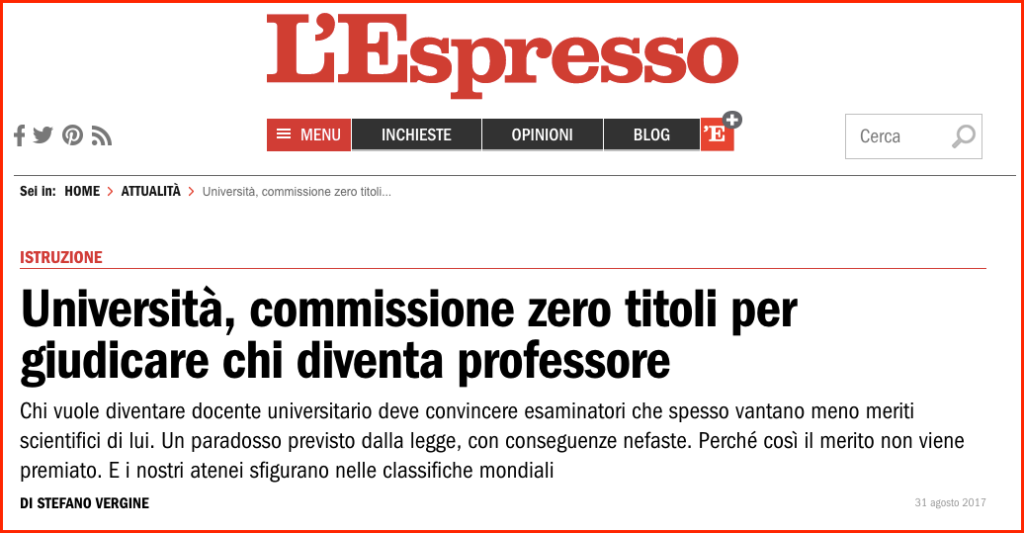 Bisogna dire che non è la prima volta che l’Espresso si cimenta in modo maldestro con il genere giornalistico delle “malefatte accademiche”. In un altro caso, si perorava la causa di un aspirante professore che in dieci anni aveva al suo attivo due lavori indicizzati nelle banche dati: un articolo scientifico su rivista internazionale ed un solo altro lavoro in inglese apparso in un volume che raccoglieva gli atti di un congresso. Il commento che avevamo fatto all’epoca sembra rimanere più che mai attuale:
