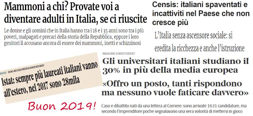 Negli ultimi mesi sono stato in Erasmus in Belgio e ho guardato l’Italia dall’esterno. In Italia, quando svolgi stage o tirocini, essere pagati è un’eccezione. La logica è “Devi fare gavetta, ti sto insegnando il mestiere – non ti pago, anzi dovresti essere tu a pagare me semmai”. Questa logica all’estero non esiste, o quasi. La stampa parla di questo fenomeno in maniera alquanto contraddittoria. Il Corriere è capace un giorno di ospitare la lettera del solito imprenditore che si lamenta dei giovani “choosy” e sfaticati, il giorno dopo di elogiare quanto siamo sgobboni rispetto ai colleghi europei. Poi vai a vedere che lavoro offre questo imprenditore: commerciale esperto di Russia e paesi arabi (quindi ultra-specializzato e formato), finta partita IVA per non pagare i contributi e lasciarti a casa alla bisogna (quando sei di fatto un dipendente), primi 6 mesi lavori gratis (stai imparando il mestiere, no?), poi stipendio di 1600 euro (a Milano, dove la vita non è certo economica). “Ma in Italia il lavoro è ultra tassato, i contributi bla bla…”. Anche negli altri paesi esistono le tasse, in Belgio ad esempio i contributi previdenziali sono più alti che in Italia. Senza un lavoro soddisfacente, non possiamo “diventare adulti” e rimaniamo “mammoni”. Raccontare che siamo viziati e snob rispetto ai nostri genitori ci fa perdere di vista le vere cause. Se non le vedi, non puoi neppure iniziare a trovare soluzioni. Questi sono i buoni propositi per il 2019: rifiutare la superficialità, esigere dai media e dalla politica profondità, comprendere la situazione, avere la costanza e la determinazione di cambiarla.