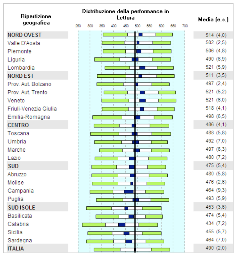 Figura 1. Punteggi PISA 2012 nella lettura per regione e circoscrizione. Fonte Invalsi, 2012