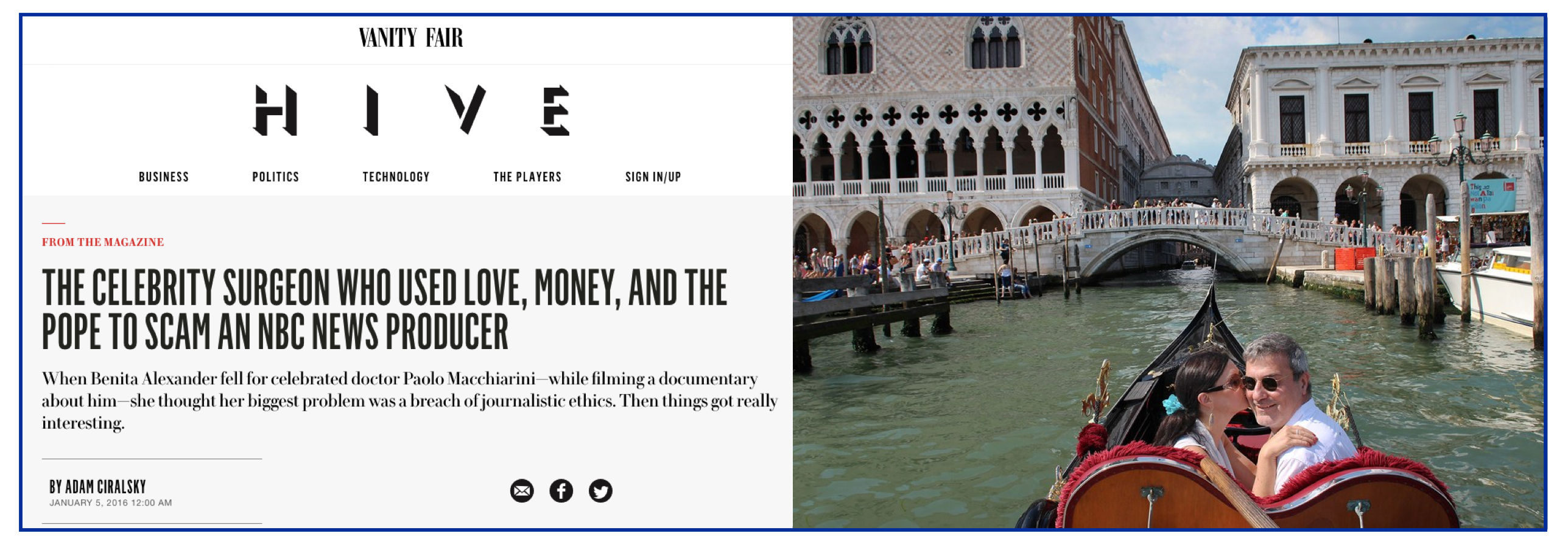non si parla solo della produttrice Tv americana Benita Alexander, sedotta e abbandonata dal fascinoso chirurgo, che le promette di sposarla con il Papa come celebrante. Vanity Fair accusa Macchiarini anche di aver falsificato il suo curriculum.