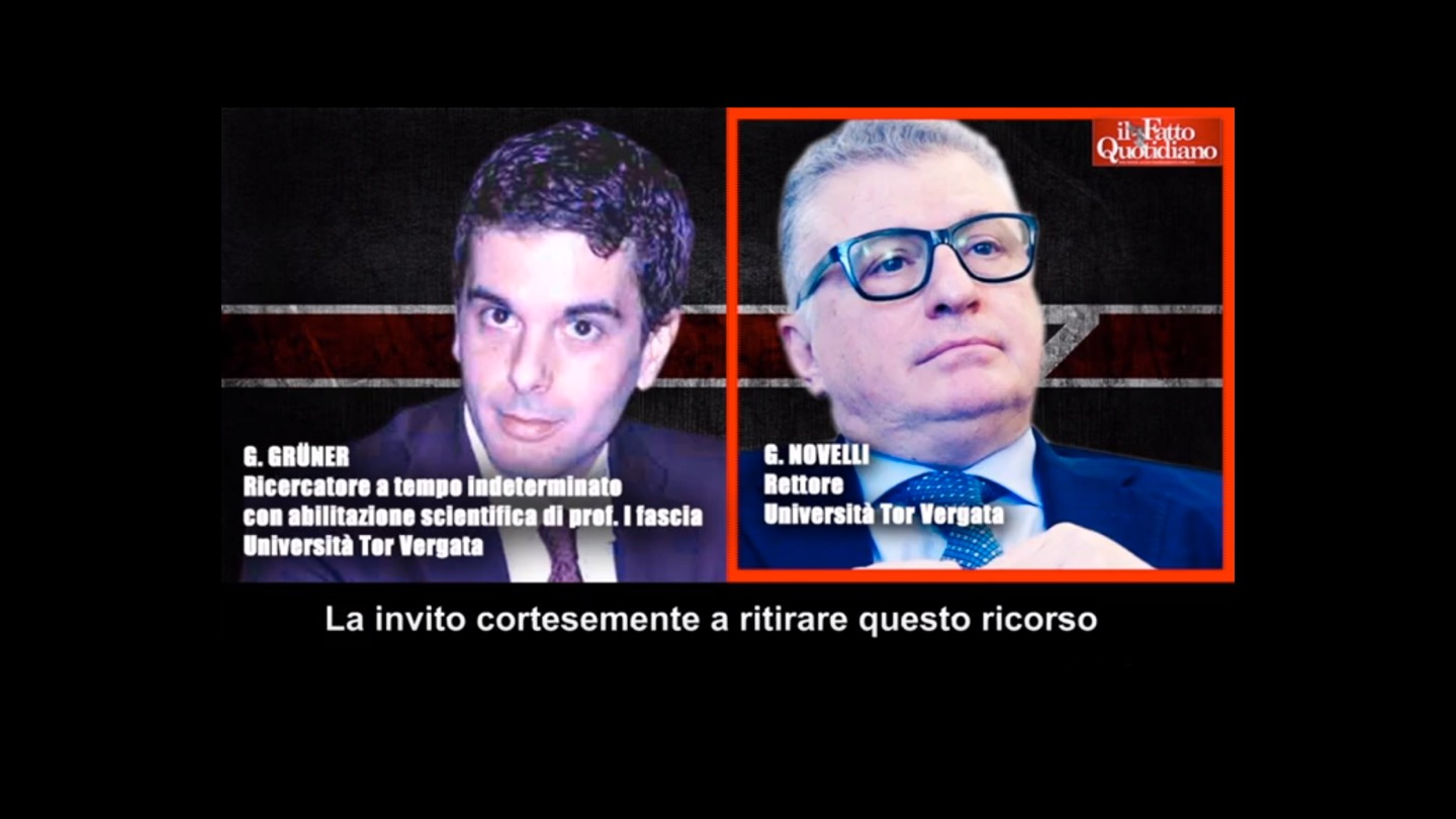 presso l’università di Tor Vergata, il 4 aprile 2018, quindi in un solo giorno, sarebbe accaduto quanto segue: 1) sarebbe stato modificato il regolamento sui procedimenti disciplinari a carico dei docenti, attraverso l’introduzione di un nuovo comma 16 all’art. 5, secondo cui, in caso di “impedimento” del rettore, anche per “conflitto di interessi”, l’avvio del procedimento disciplinare spetta non più al pro rettore vicario, bensì al “decano” (si tratta di una figura, quest’ultima, non prevista dalla legge, che corrisponde al docente più anziano in ruolo); 2) il direttore generale dell’ateneo, Giuseppe Colpani, avrebbe scritto una nota al rettore, nella quale avrebbe rappresentato che, da un articolo pubblicato su “Il Messaggero”, edizione locale di Civitavecchia, il giorno 19 gennaio 2018, si desumerebbe che Grüner, nell’anno 2012, avrebbe esercitato la professione di avvocato, a favore del Comune di Civitavecchia, quando era necessariamente in regime di impegno universitario a tempo pieno (perché nel primo triennio di conferma), e che sarebbe stato opportuno avviare nei suoi confronti un procedimento disciplinare; 3) il rettore Novelli avrebbe risposto al direttore generale che, in base alla nuova norma regolamentare (quella introdotta lo stesso 4 aprile), e trovandosi lui in conflitto di interessi, la competenza doveva essere del decano; 4) il decano, professor Mauro Nacinovich (che insegna geometria), avrebbe avviato il procedimento disciplinare a carico di Grüner, delegando il professor Enrico Gabrielli (che insegna diritto civile);