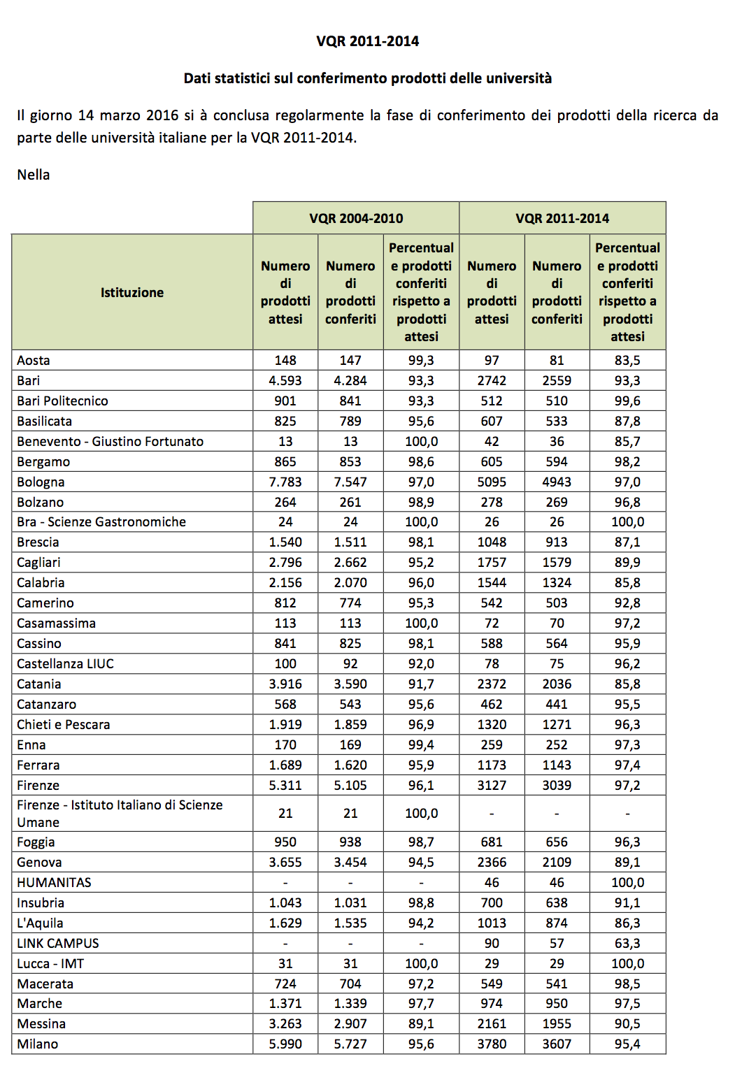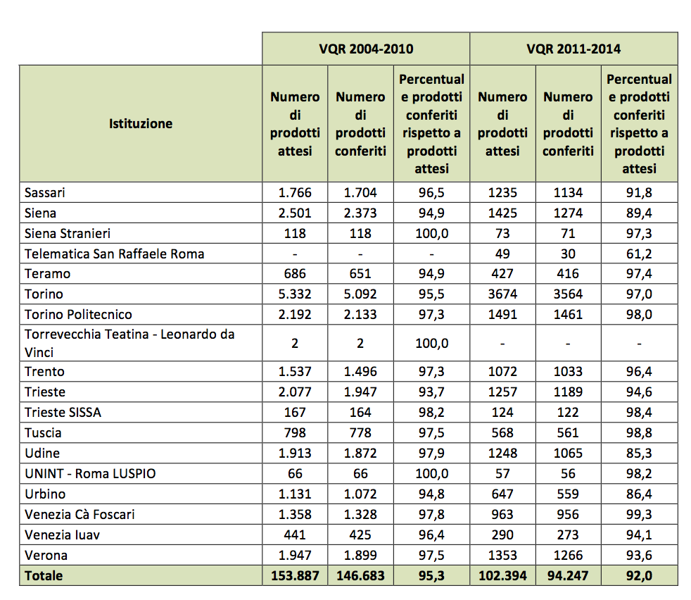 Viste le statistiche relative al conferimento dei prodotti alla VQR 2011-2014, l’ANVUR si complimenta con la comunità accademica italiana. L’adesione delle università all’esercizio di valutazione permetterà all’Agenzia di procedere con l’esercizio di valutazione e di generare nei tempi dovuti la seconda istantanea dello stato della ricerca italiana. L’università italiana ha così dimostrato di aver compreso pienamente il valore di un esercizio di valutazione che sta coinvolgendo oltre 400 illustri colleghi italiani e stranieri nelle attività degli esperti GEV e quasi 11.000 (a oggi) ricercatori italiani e stranieri che hanno già accettato di svolgere l’attività di revisori peer.