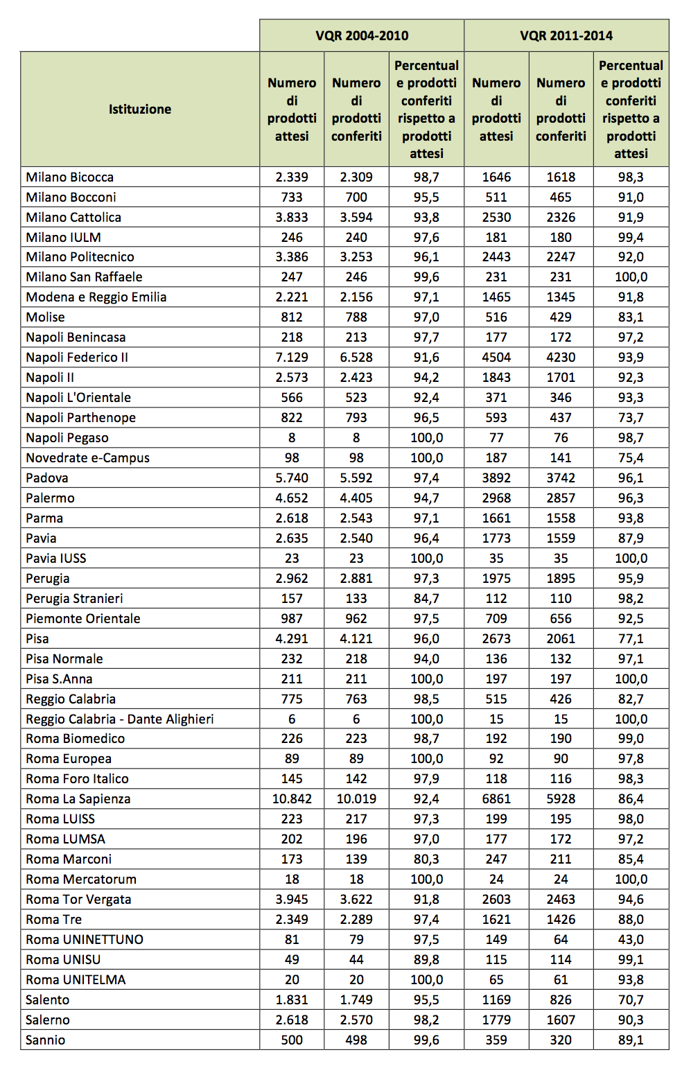 «Fallisce la protesta contro la valutazione» titola Repubblica. «Sono molto felice oggi, anche se non ero preoccupato ieri» dichiara il Presidente dell’ANVUR a Repubblica, commentando le percentuali di conferimento dei prodotti della VQR. Globalmente, secondo i dati forniti da ANVUR i prodotti conferiti sarebbero il 92% di quelli attesi. Secondo ANVUR ci sono «(pochi) casi particolari di atenei nettamente al di sotto della media, atenei nei quali si è concentrata evidentemente l’astensione dal presentare prodotti alla VQR». Tra i 32 atenei al di sotto della media abbiamo: Salento (70,7%), Napoli Parthenope (73,7%), Pisa (77%), Reggio Calabria (82,7%), Catania (85,8%), L’Aquila (86,3%), Urbino (86,4%), Roma Sapienza (86,4%), Brescia (87,1%), Basilicata (87,8%), Pavia (87,9%), Roma Tre (88%), Sannio (89,1%), Genova (89,1%), Siena (89,4%), Cagliari (89,9%), Salerno (90,3%), Messina (90,5%), Milano Bocconi (91%). Duole dire che non avremo «una fotografia dettagliatissima e, soprattutto, certificata della qualità della ricerca italiana». Il MIUR, se utilizzerà questa VQR, si troverà a distribuire la quota premiale in funzione della non adesione alla protesta, in larga misura correlata alla capacità di coercizione messa localmente in atto dai rettori. Alla luce di questi dati è possibile dire che la VQR è morta.