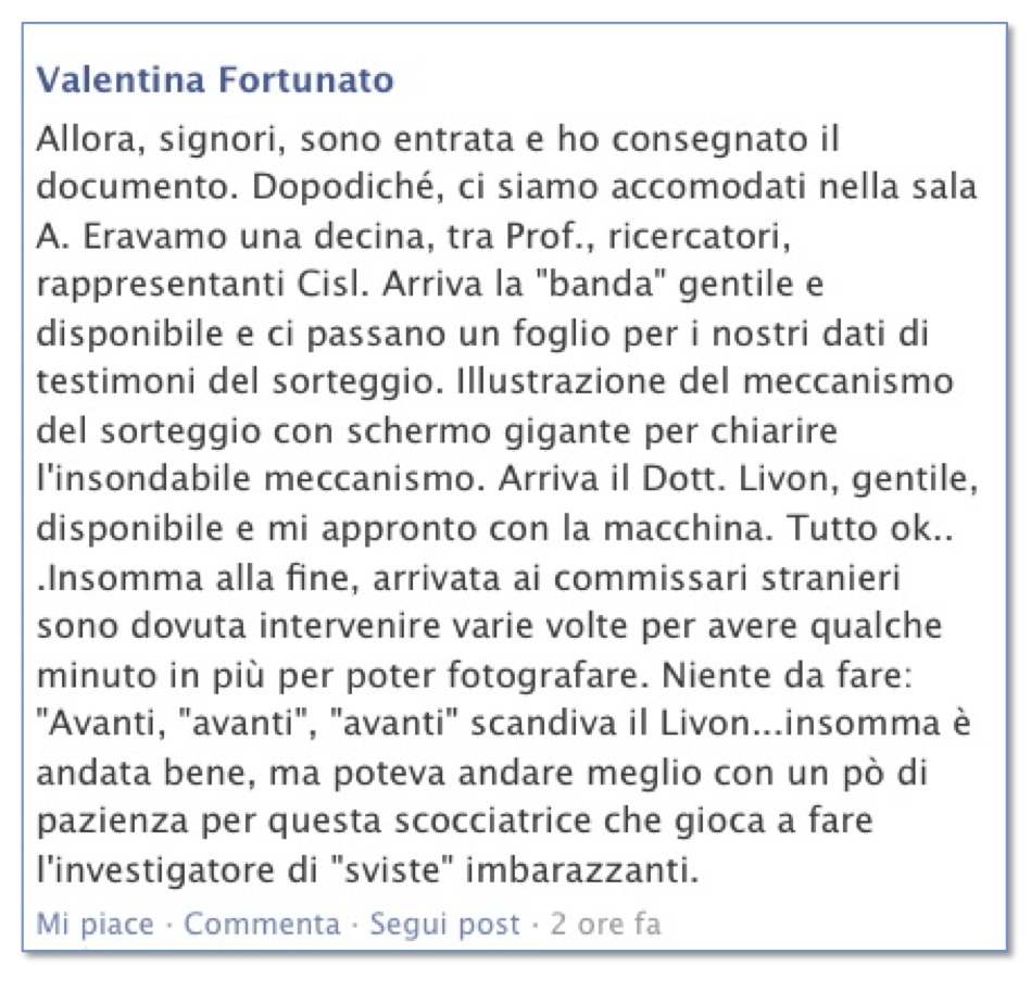 Oggi si è ripetuta una scena analoga, solo che la testimone-fotografa era Valentina Fortunato, a cui va il ringraziamento da parte della redazione e dei lettori di ROARS. Anche questa volta la cronaca del sorteggio e le relative foto sono state pubblicate sul gruppo facebook di ROARS.