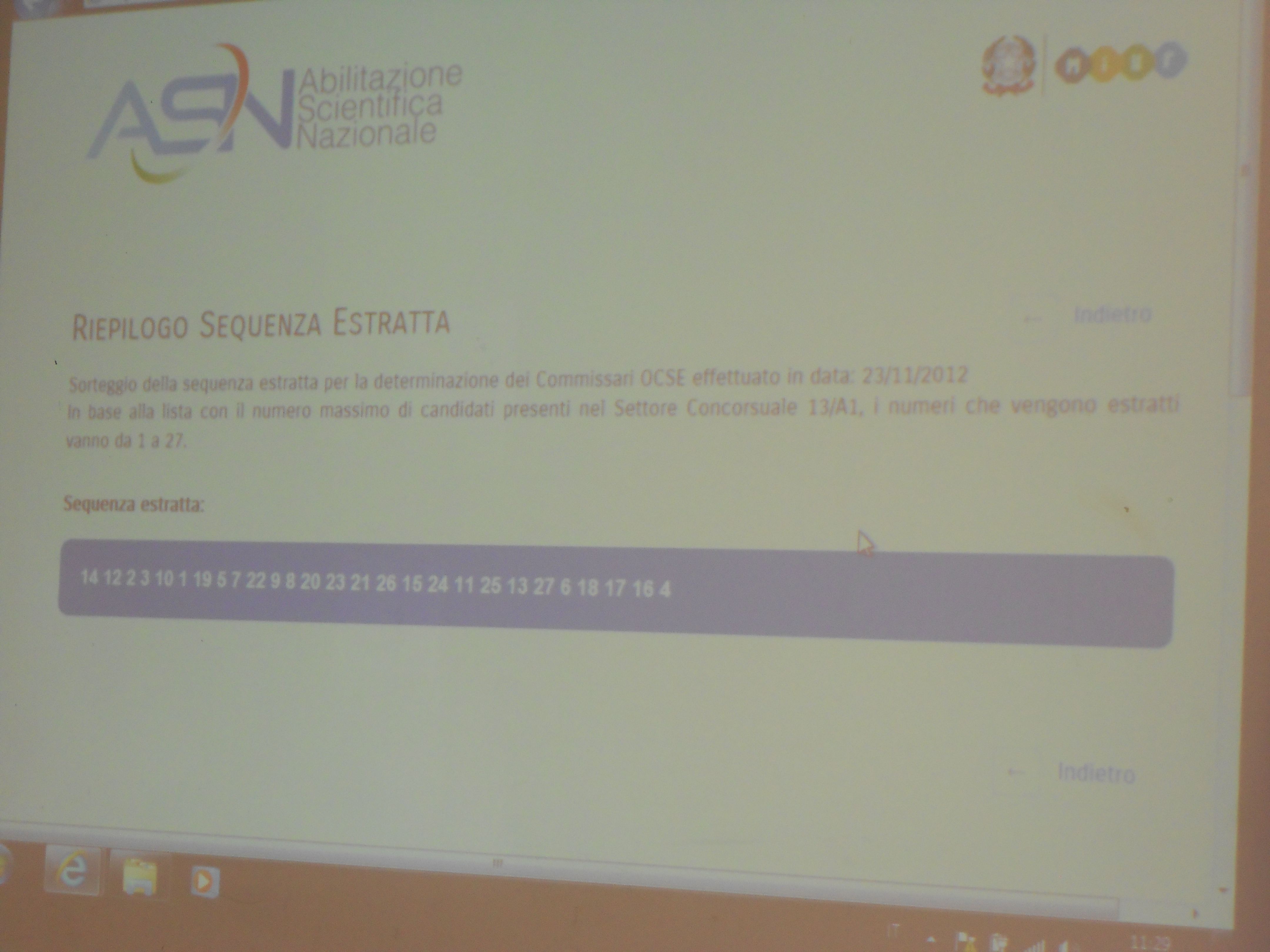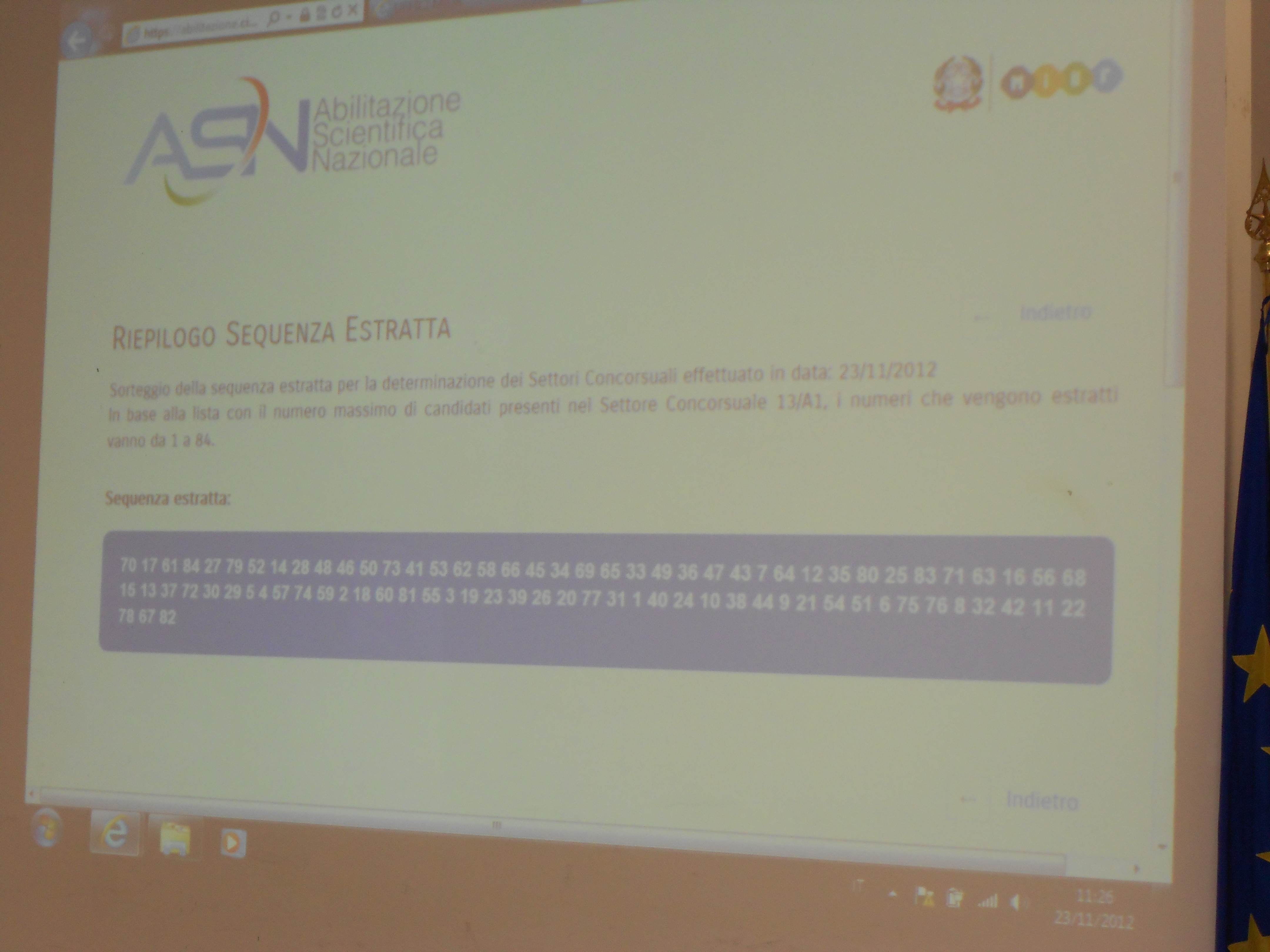 Nella precedente sessione di sorteggio, Domizia Orestano aveva presenziato in qualità di testimone al sorteggio pubblico scattando le foto delle due sequenze numeriche sorteggiate, quella per selezionare i commissari italiani (quattro per commissione) e quella per la selezione dei commissari OCSE (uno per commissione). Abbiamo già notato che, grazie alle osservazioni della Orestano, è stato sventato l’uso di una procedura irregolare per la selezione dei commissari OCSE (Commissioni: una testimone sventa sorteggi irregolari?). Avevamo anche pubblicato le foto delle due sequenze che erano state tempestivamente pubblicate sul gruppo facebook di ROARS.