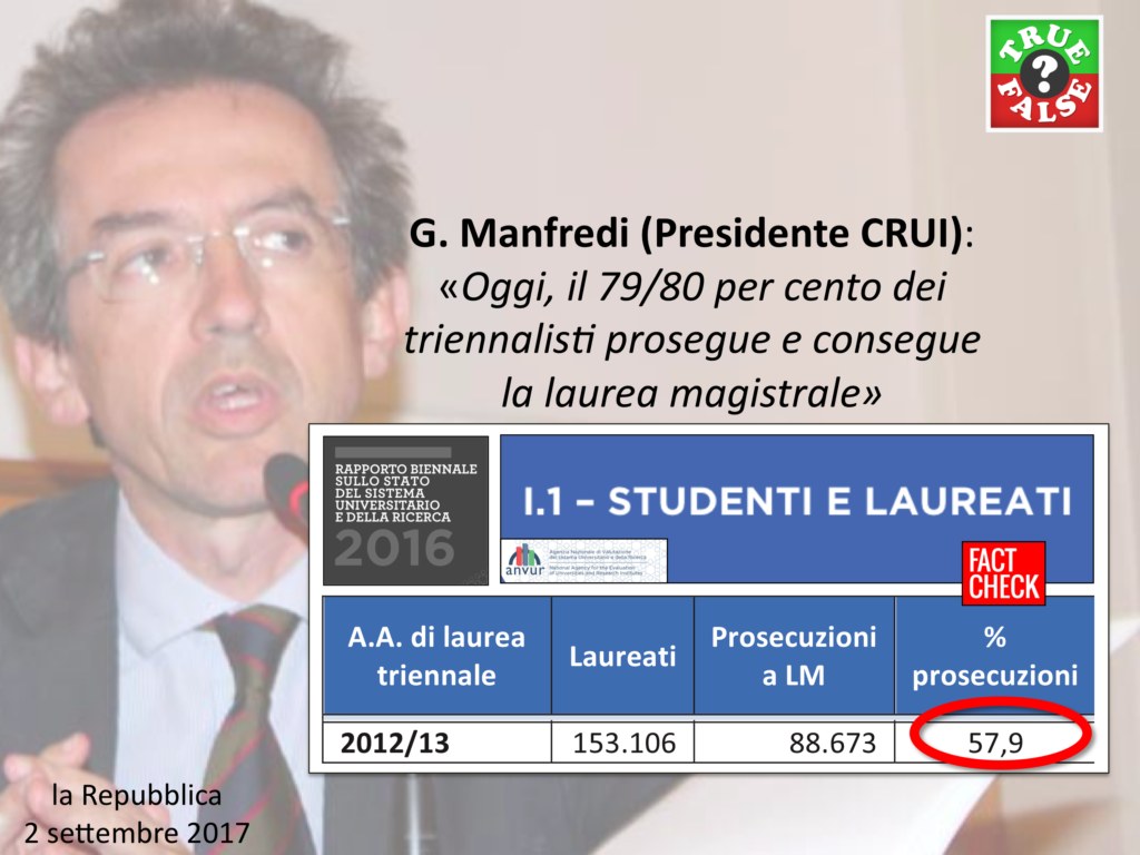 Sempre secondo il Rapporto Anvur (pag. 130), nei corsi di laurea di secondo livello i tassi di abbandono più recenti si aggirano intorno al 15%. Basta una moltiplicazione per concludere che tra i laureati triennali quelli che proseguono e conseguono una laurea magistrale sono meno del 50%, contro il 79/80% citato da Manfredi.