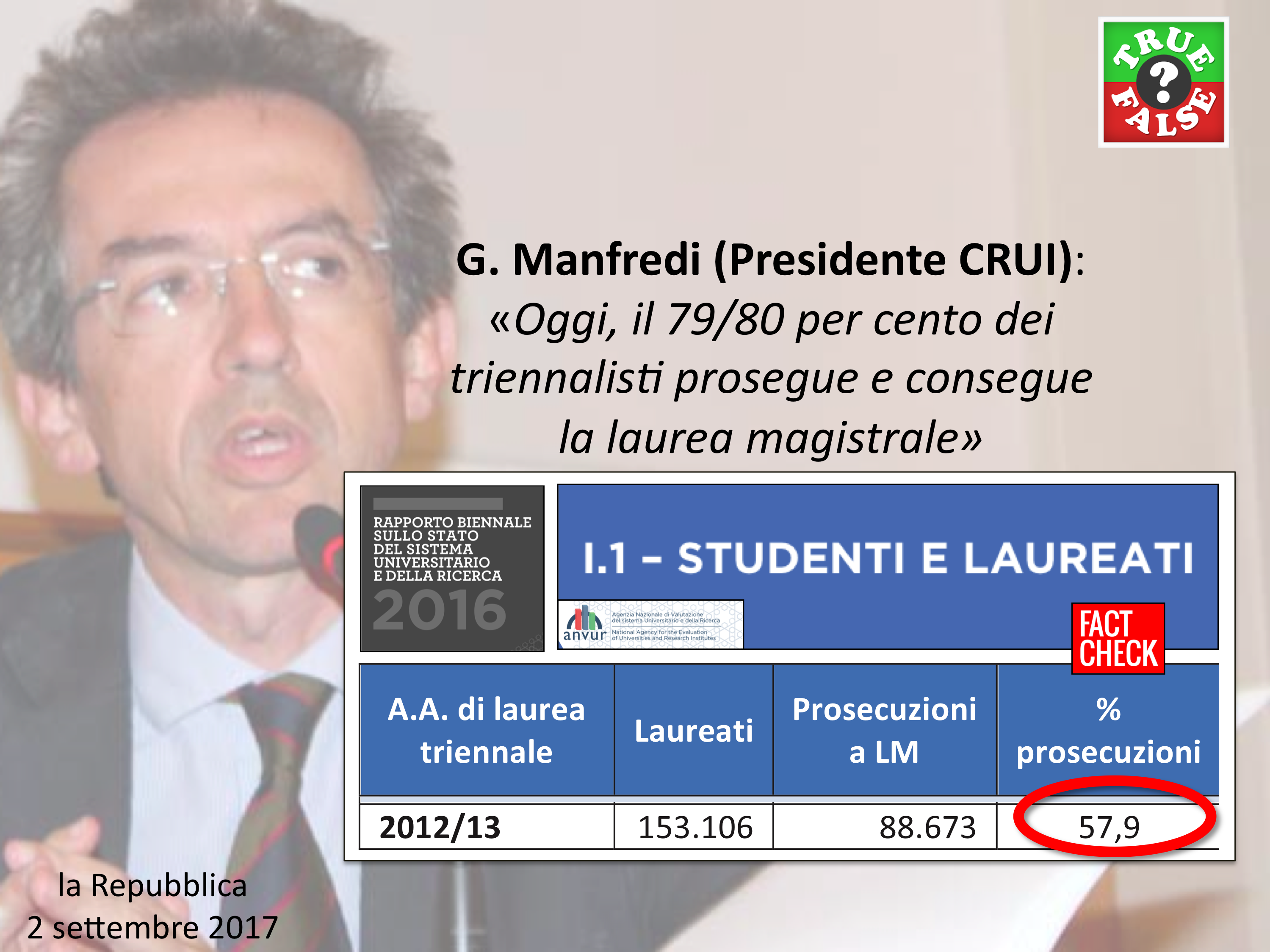 Il 2 settembre, Repubblica ha dedicato un lungo articolo al cosiddetto 3+2. Uno degli argomenti principali è il confronto numerico tra i laureati del vecchio ordinamento e i laureati magistrali di oggi, facendo finta che i laureati triennali non contino. A dar manforte a questa lettura arriva il Presidente della CRUI, Gaetano Manfredi, secondo il quale