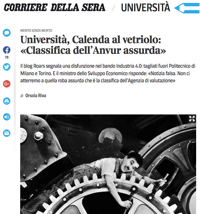 I requisiti per partecipazione al bando Competence Centers Industria 4.0 mietono vittime illustri tra gli atenei. Viene richiesto di posizionarsi “nelle aree di interesse per le attività previste, nel primo quartile dell’indicatore R e dell’indicatore X” della VQR. Come segnalato da Roars sulla base degli esiti ufficiali della VQR pubblicati sul sito dell’Anvur, vi sono università, come Roma Sapienza, Pisa e Napoli Federico II che non rientrano nel primo quartile in nessuna delle aree del bando e altre, come i Politecnici, che rimangono eslcuse proprio dalle aree ingegneristiche. La notizia, oltre ad essere stata ripresa dal Mattino di Napoli e da Corriere Università è stata oggetto di un’ampia intervista a Giuseppe De Nicolao mandata in onda da Radio 24. E Repubblica? Il suo inviato Corrado Zunino, senza attardarsi su documenti e  dati, ha impartito via twitter la sua lezione di fact-checking giornalistico: la notizia è “non verificata” perché “smentita in 4 ore da un ministro”. In altre parole: rigore è quando Calenda fischia. Redazione Roars gli ha risposto allegando virgolettato del bando e tabella del rapporto VQR in cui sono evidenziati gli atenei che si posizionano nel primo quartile (e quelli che non ce la fanno).