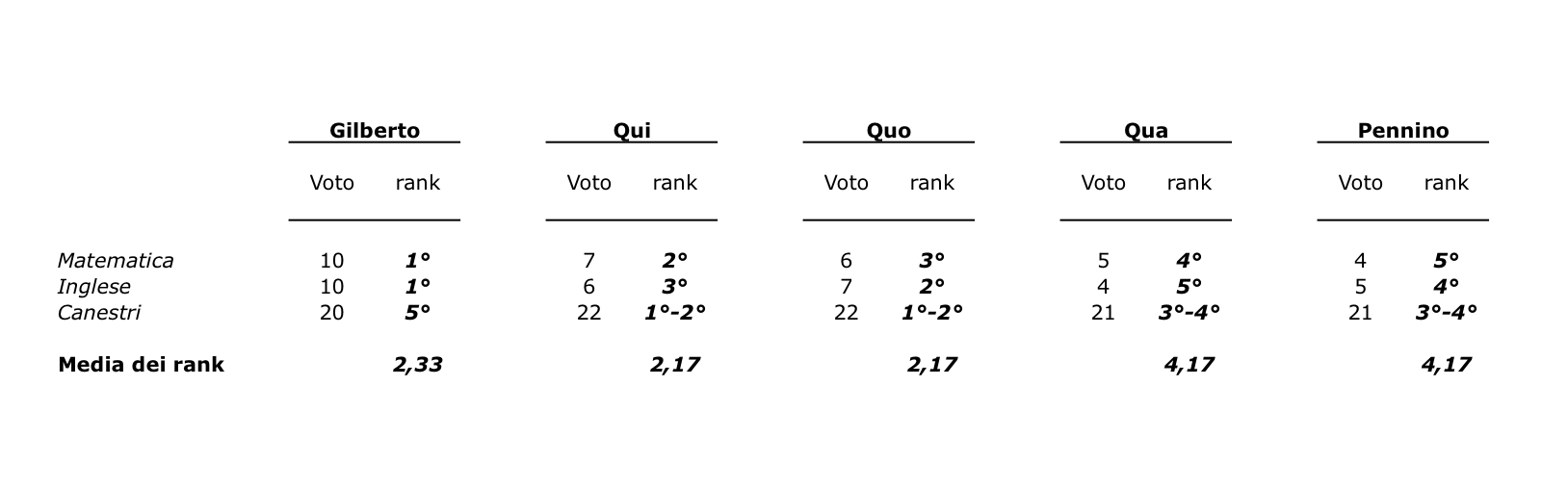 Nonna Papera organizza una festa per Qui, Quo, Qua ed anche per Gilberto (il nipote di Pippo, noto studente prodigio) e per Pennino, un personaggio meno noto, nipote di Paperoga. La nonna vuole approfittare dell’occasione per premiare con caramelle e cioccolatini i due ragazzi che sono più bravi a scuola e nello sport. Per questo scopo, la nonna trascrive, per tutti e cinque i ragazzi, i voti in Matematica, in Inglese ed anche il numero di canestri che hanno messo a segno nel torneo di basket scolastico (vedi Tabella 1). Gilberto è bravissimo a scuola – ha ben due “10” – ma un po’ meno nel basket. Non potendo sommare voti scolastici e canestri, il manuale di Nonna Papera consiglia di costruire tre classifiche distinte e poi attribuire ad ogni ragazzo un voto uguale alla media delle sue posizioni nelle tre classifiche di Matematica, Inglese e canestri. Al lettore è chiesto di ricavare la soluzione. I “pari merito” sono trattati nel modo più logico: se nella classifica dei canestri, Qui e Quo sono primi alla pari, si spartiscono i primi due “ranks”: (1+2)/2 = 1,5 punti a testa.