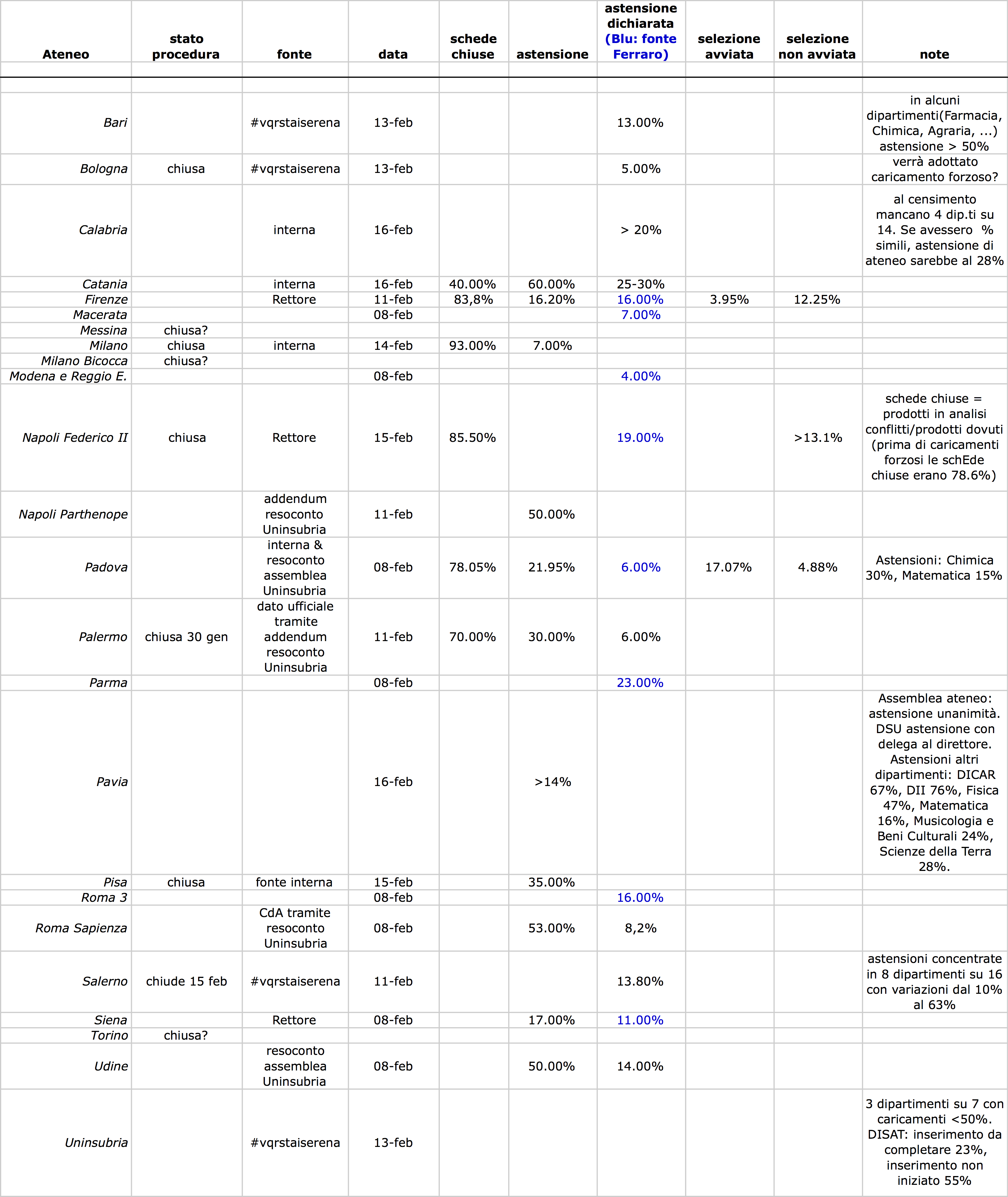 Posso anticipare che Bologna adotterà il caricamento forzoso. Non è dato di sapere se il dato del 5% di adesioni a Bologna è reale. I numeri forniti dal prorettore alla ricerca dicono 200 astenuti su circa 3000 docenti . Saremmo quindi più alti. I dati non sono stati resi pubblici quindi non sono verificabili. Voce di corridoio : Crui o Anvur (non è ben chiaro, ripeto è voce di corridoio) avrebbe commissionato un software per il reperimento online dei prodotti dei docenti e anche per il caricamento forzoso. Aspettiamo smentite.